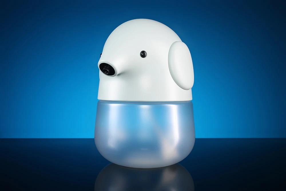 - верхняя – декоративная крышка в виде головы слоника, куда встроен сенсорный датчик, механизм вспенивания мыла и подачи пены.