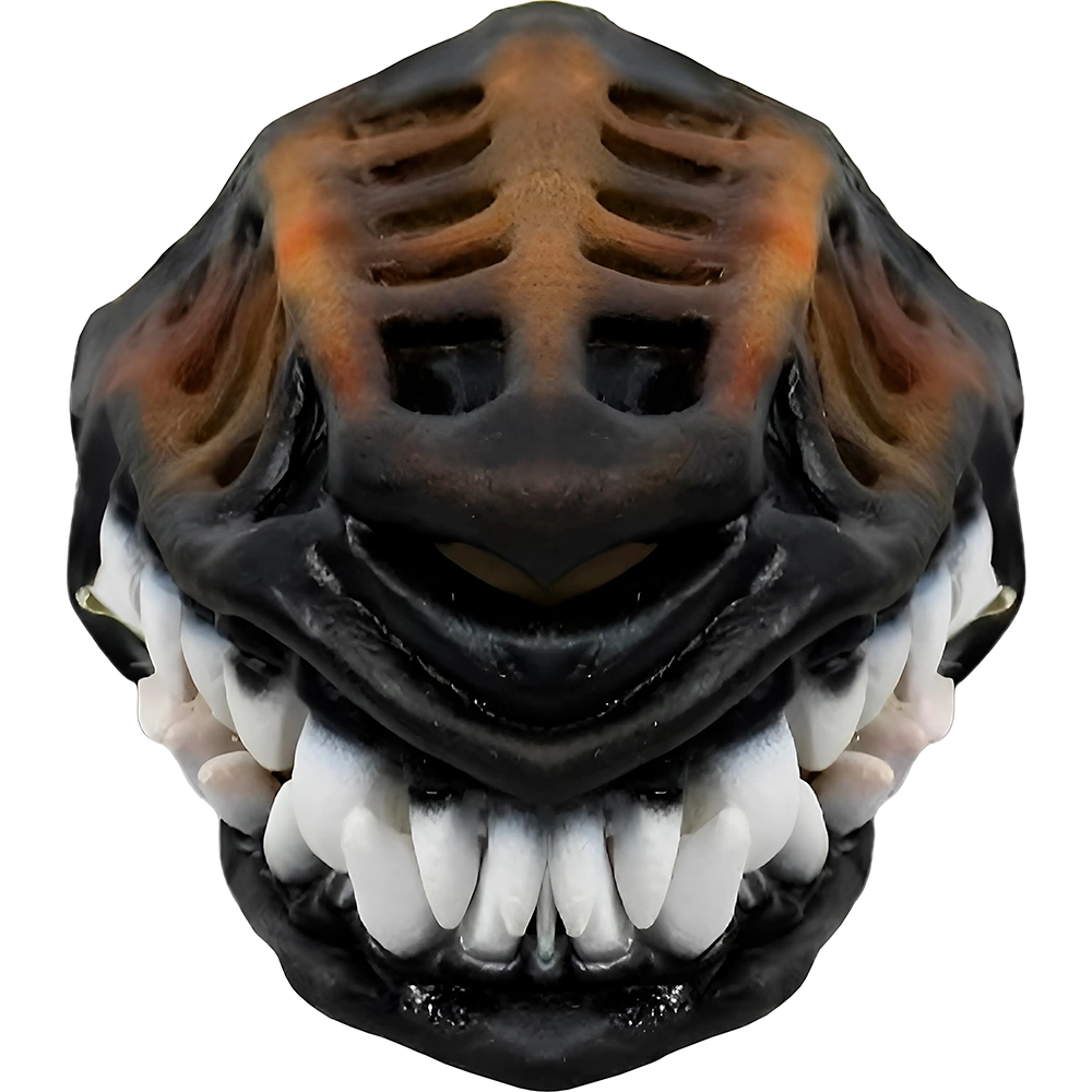 Маска с зубами для собак выполнена с проработанными выемками, напоминающими структуру черепа, благодаря чему создаётся зловещий визуальный акцент, особенно заметный под направленным светом.