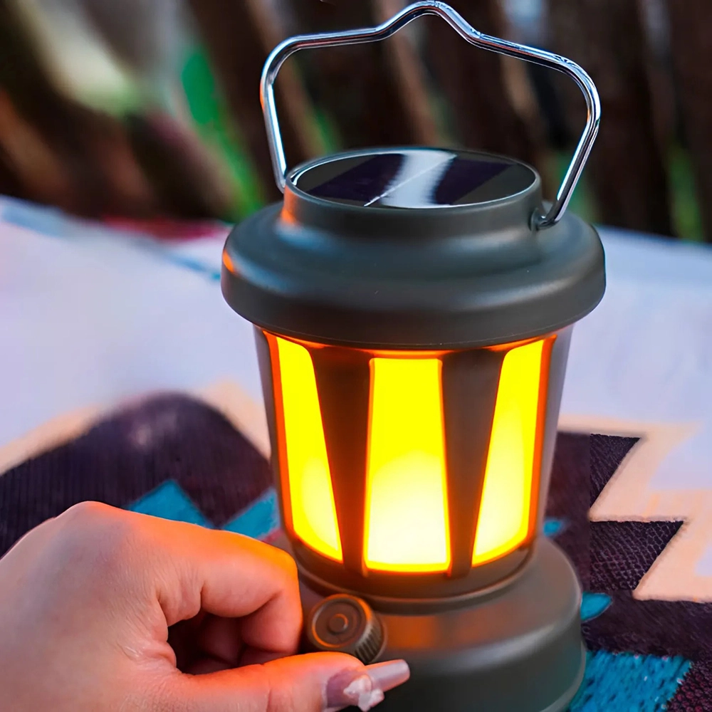 Кемпинговый фонарь с солнечной панелью заряжается от солнечных лучей днем и освещает пространство ночью, экономя энергию и батарейки.