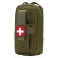 Маленькая сумочка фиксируется на поясе при помощи MOLLE. Плотный ремешок с металлической закрепкой исключает произвольное расстегивание. Спереди аптечка тактическая для первой помощи с опознавательным красным крестом. Силиконовая нашивка на ремешке с липучкой, который удерживает смартфон в переднем кармане. Чтобы влага в нем не скапливалась, в стенке проделано отверстие и окантовано металлическим кольцом.