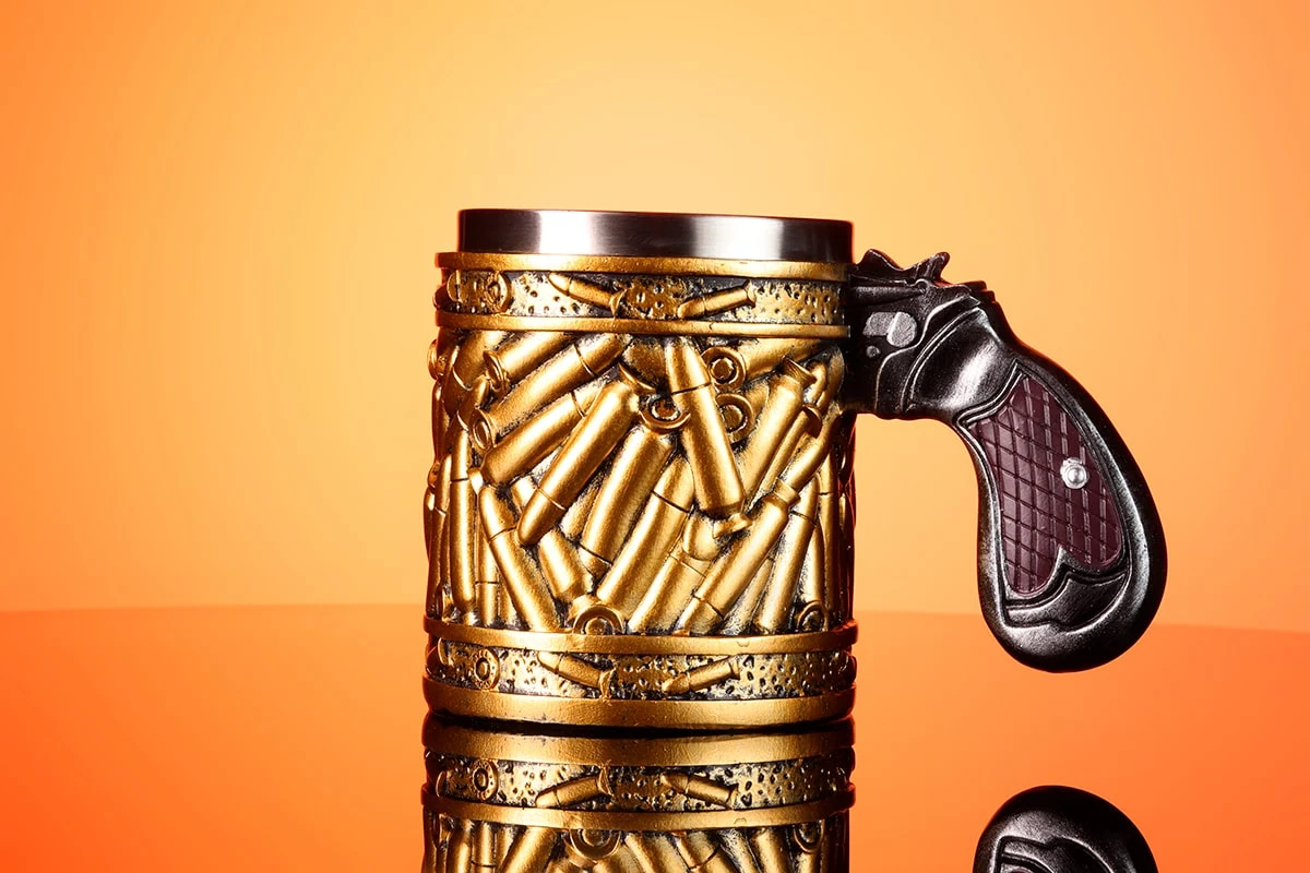 - Патроны. Кружка обрамлена со всех сторон патронами. Они изготовлены из специальной эпоксидной смолы, что делает их объемными, натуральными, а так же устойчивыми к высокой температуре.